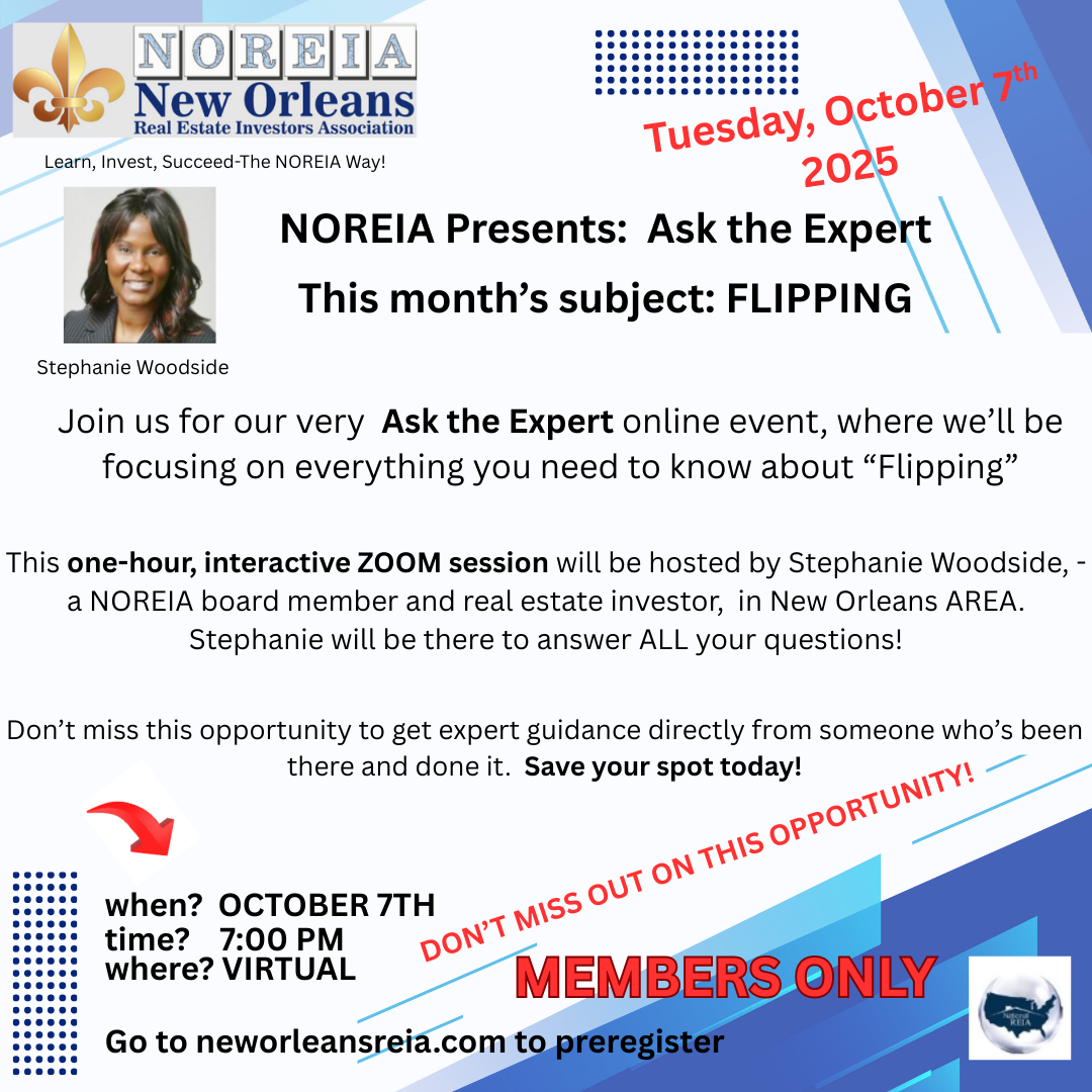 This is a virtual event that is held by one of our board members with experience in house flipping. Stephanie Joy Woodside will hold a 1 hour virtual event where she will answer any and all questions related to house flipping.